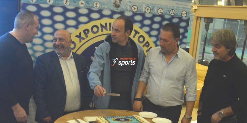 Ο Ιορδάνης Χατζηεφραιμίδης κόβει την πίτα έχοντας εκ δεξιών του τον Στ. Κολόζο και τον Άρη Μπιντάκα και εξ αριστερών του τον Γιώργο Τάκη και τον Ηλία Τζανετόπουλο