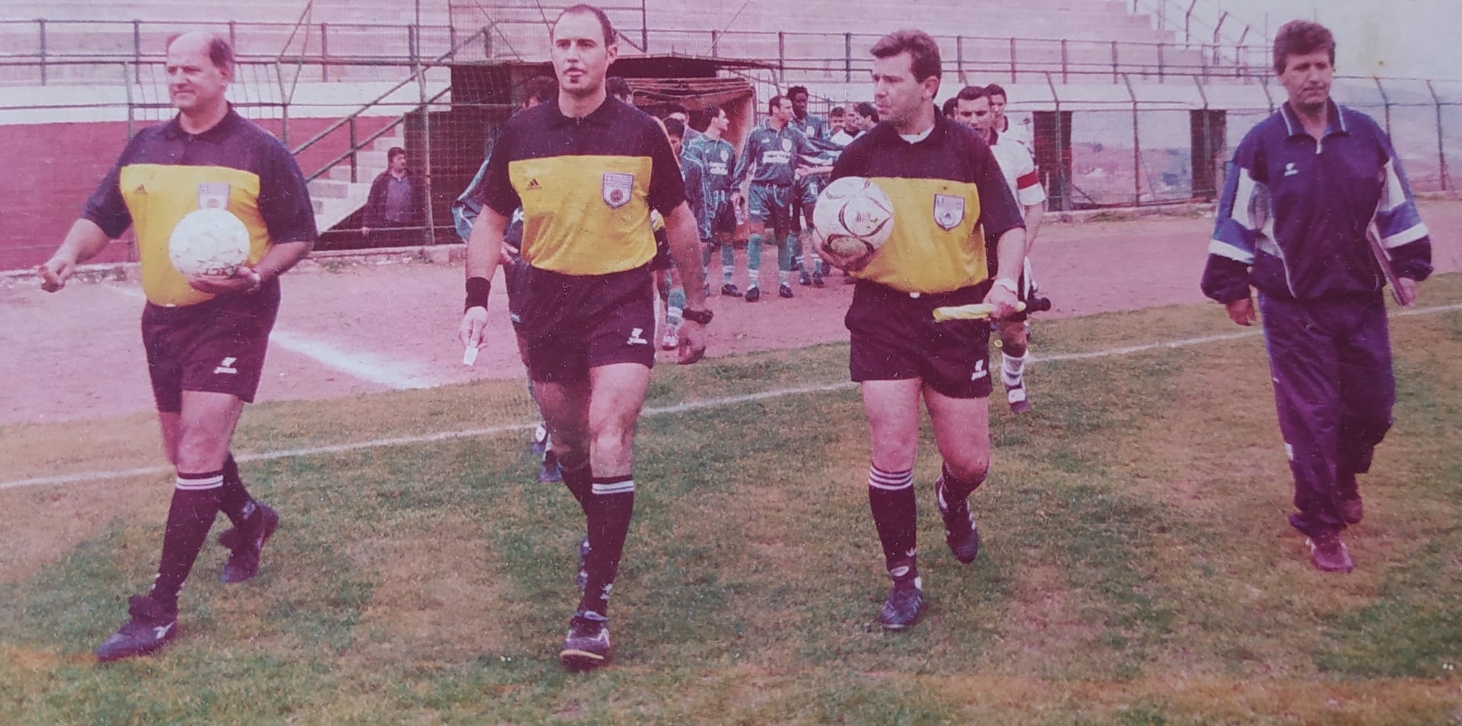 Στη φωτογραφία από αριστερά οι κ.κ. Μίχας (βοηθός), Χρήστου (διαιτητής), Παγωνόπουλος (βοηθός) και Κιούσης (4ος διαιτητής) σε εκείνο το ματς.