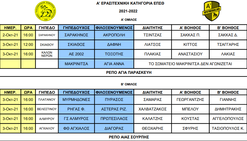 Με την αγωνιστική δράση της Α’ ΕΠΣΘ να αρχίζει τελικά το ερχόμενο Σαββατοκύριακο, η Ένωση ανακοίνωσε τα διαιτητικά σχήματα των αγώνων της 1ης αγωνιστικής, σε Α’ και Β’ Όμιλο.