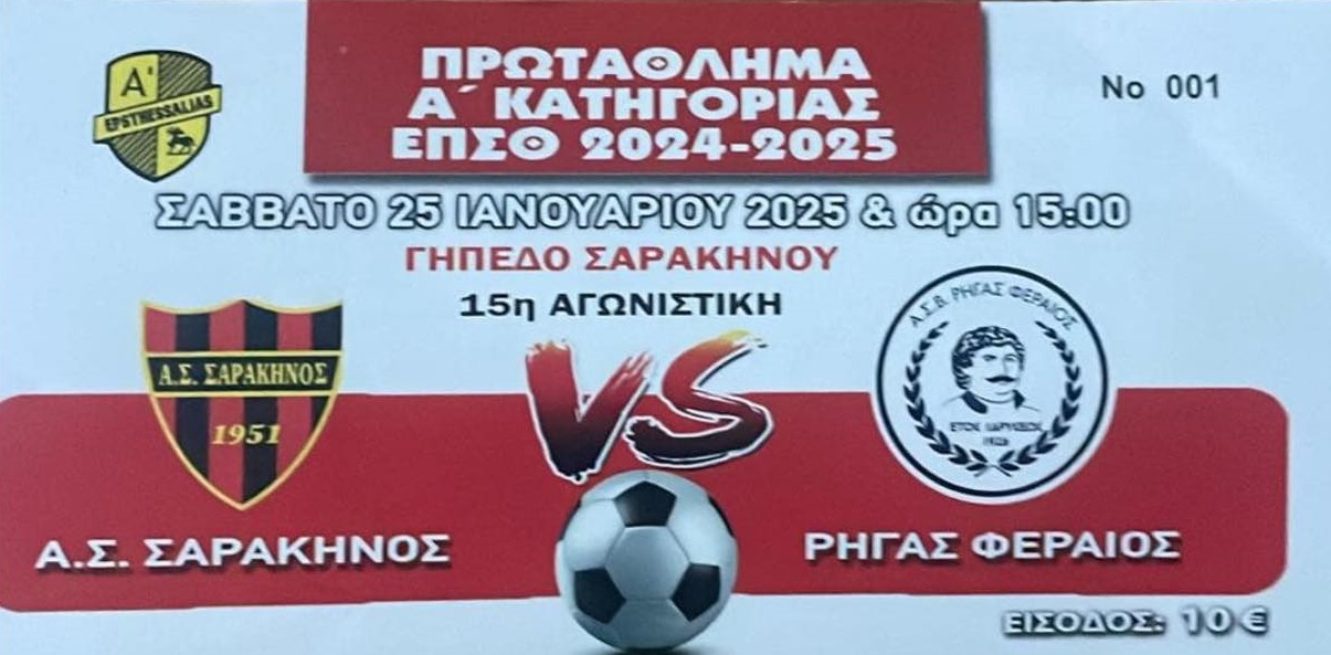 «Ο Α.Σ. Σαρακηνός 1951 ενημερώνει τους φιλάθλους και τους φίλους του ερασιτεχνικού ποδοσφαίρου, για την διάθεση και τις τιμές των εισιτηρίων του αγώνα Σαρακηνός – Ρήγας Φεραίος, που θα διεξαχθεί το Σάββατο 25/1 στις 15:00 στο Γήπεδο Σαρακηνού.