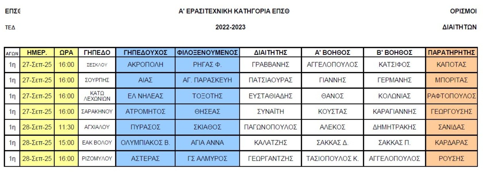 Οι διαιτητές των αγώνων στην πρεμιέρα της Α’ ΕΠΣΘ το Σαββατοκύριακο 27-28/9 ανακοινώθηκαν από την Τοπική Επιτροπή Διαιτησίας. Ο Καλατζής της Σούπερ Λιγκ 2 θα είναι ο αρχών της συνάντησης Ολυμπιακός Βόλου-Αγία Άννα.