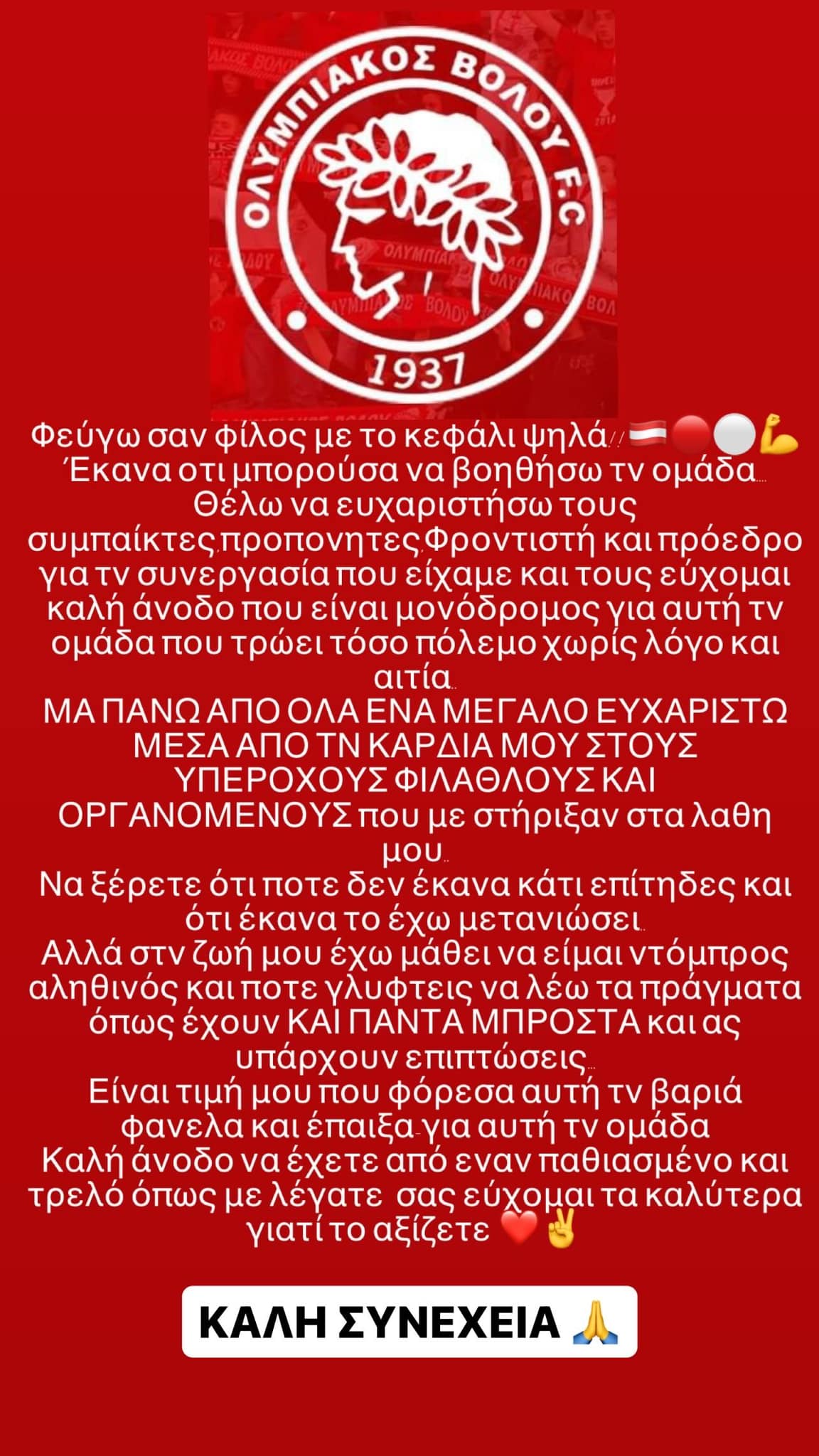 Συγκεκριμένα αναφέρει: «Φεύγω σαν φίλος με το κεφάλι ψηλά. Έκανα ό,τι μπορούσα να βοηθήσω την ομάδα. Θέλω να ευχαριστήσω τους συμπαίκτες, προπονητές, φροντιστή και πρόεδρο για τη συνεργασία που είχαμε και τους εύχομαι καλή άνοδο που είναι μονόδρομος για αυτή την ομάδα που τρώει τόσο πόλεμο χωρίς λόγο και αιτία