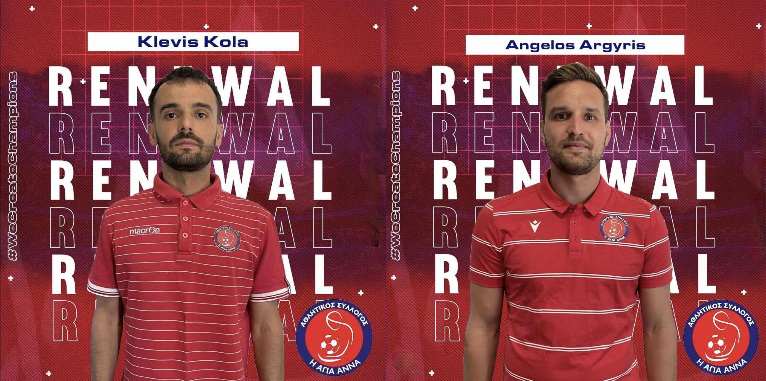 Αναλυτικά: «Ο ΑΣ «Η Αγία Άννα» ανακοινώνει με χαρά την ανανέωση της συνεργασίας της με δύο σημαντικούς ποδοσφαιριστές, τον Άγγελο Αργύρη και τον Κλεβί Κόλα, για τη νέα αγωνιστική περίοδο.