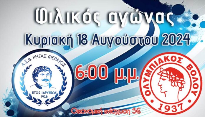 Στα πέντε ευρώ ορίστηκε η είσοδος στο φιλικό παιχνίδι Ρήγας Φεραίος-Ολυμπιακός Βόλου, με τους Βελεστινιώτες αναφέρουν για κυριακάτικο παιχνίδι: «Φιλικό “ντέρμπι” στο Βελεστίνο. Αύριο Κυριακή 18 Αυγούστου και ώρα 6 μ.μ. η ομάδα μας φιλοξενεί τον Ολυμπιακό Βόλου, περυσινό πρωταθλητή της Α’ κατηγορίας της ΕΠΣΘ, σε ένα δυνατό φιλικό αγώνα και για τις δύο ομάδες στο πλαίσιο της προετοιμασίας για την καινούρια σεζόν…».
