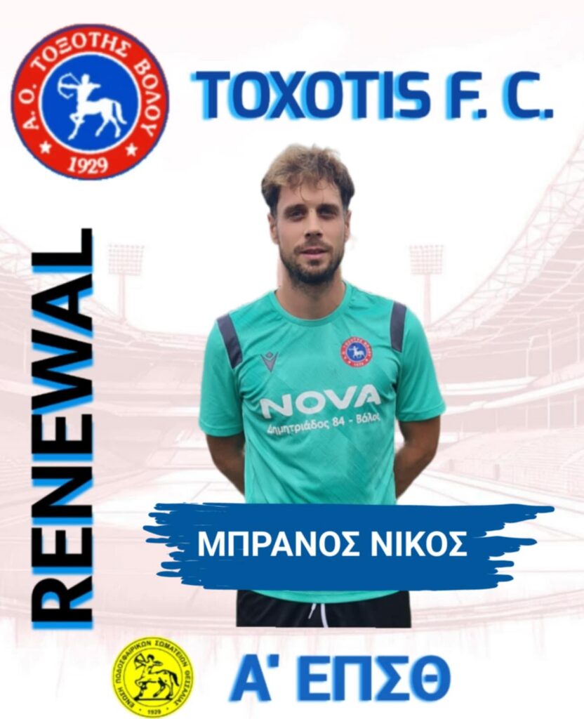 Η ανακοίνωση: «Ο Α.Ο. Τοξότης Βόλου ανακοινώνει την ανανέωση της συνεργασίας με τον ποδοσφαιριστή ΝΙΚΟ ΜΠΡΑΝΟ για τη σεζόν 2025-26.
