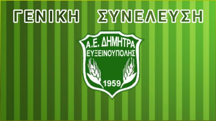 Τη Δευτέρα 5 Μαΐου 2025 η Δήμητρα Ευξεινούπολης συγκαλεί Γενική Συνέλευση, στην οποία θα γίνουν διοικητικός και οικονομικός απολογισμός, παραίτηση της νυν διοίκησης μετά τη λήξη της διετούς θητείας της και ορισμός ημερομηνίας εκλογών για την ανάδειξη νέου Δ.Σ.