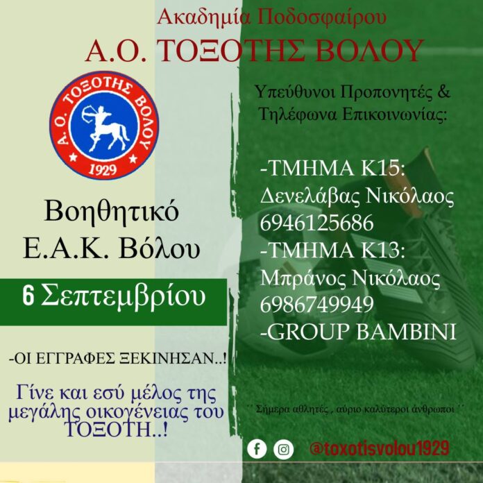 Ξεκίνησαν οι εγγραφές για την ακαδημία ποδοσφαίρου του Τοξότη για παιδιά ηλικίας 5 -15 ετών.