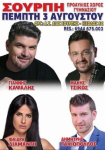 Μεγάλη βραδιά με καλλιτεχνικό πρόγραμμα διοργανώνει ο Αίας Σούρπης στις 3 Αύγουστου. Γιάννης Καψάλης, Μάκης Τσίκος, Φαίδρα Διαμάντη Δημήτρης Γακιόπουλος θα είναι οι γνωστοί καλλιτέχνες της εκδήλωσης του Αίαντα που θα γίνει 3/8 στον προαύλιο χώρο του γυμνασίου Σούρπης.