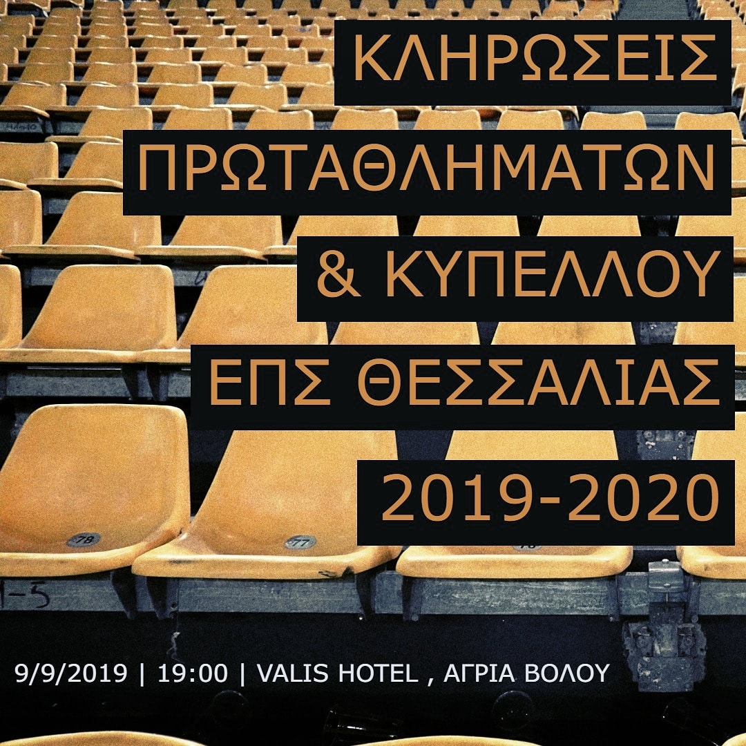 Τη Δευτέρα 9/9 και ώρα 19:00 στο ξενοδοχείο Valis Resort θα πραγματοποιηθούν οι κληρώσεις των πρωταθλημάτων και του Κυπέλλου της ΕΠΣ Θεσσαλίας για την περίοδο 2019-2020, όπως ανακοίνωσε η διοργανώτρια αρχή.