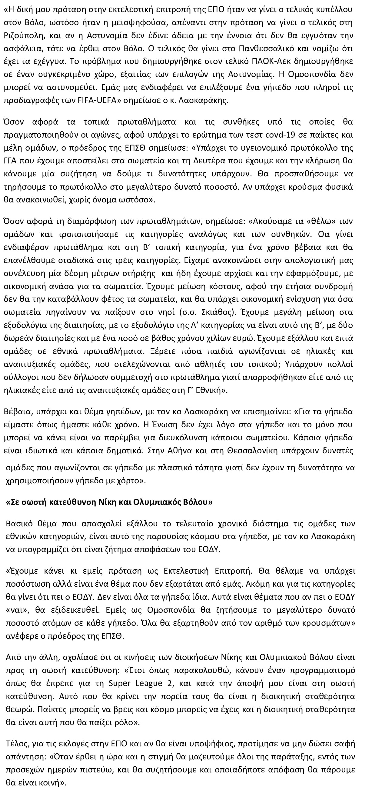Ο τελικός κυπέλλου αλλά και τα πρωταθλήματα της ΕΠΣΘ αποτέλεσαν αντικείμενο συζήτησης με τον πρόεδρο της Ένωσης Ποδοσφαιρικών Σωματείων Θεσσαλίας, Περικλή Λασκαράκη σε ραδιοφωνική εκπομπή («Classico», Βόλος 9.86), που ανέφερε ότι είχε προτείνει να διεξαχθεί ο τελικός κυπέλλου στον Βόλο, ενώ υποστήριξε ότι τα τοπικά πρωταθλήματα θα είναι φέτος ανταγωνιστικά.