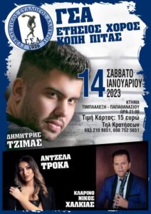 Μετά από πολλά χρόνια ο Γ.Σ. Αλμυρού διοργανώνει μια μεγάλη χοροεσπερίδα το Σάββατο 14 Ιανουαρίου 2023 στο “Κτήμα Τιμπλαλέξη-Παπαθανασίου”. Η εκδήλωση του ΓΣΑ περιλαμβάνει την κοπή πίτας για όλα του τμήματα , βραβεύσεις πλούσια λαχειοφόρο με πολλά δώρα και καλλιτεχνικό πρόγραμμα με τους Δημήτρης Τζίμα, Άντζελα Τρόκα και Νίκο Χαλκιά. “Ο μεγαλύτερος Σύλλογος της πόλης μας, ο Ιστορικός μας Γ.Σ.ΑΛΜΥΡΟΥ διοργανώνει στις 14/1 μετά από πολλά χρόνια μια μεγάλη Χοροεσπερίδα..ΚΕΦΙ- ΧΟΡΟΣ-ΠΛΟΥΣΙΑ ΛΑΧΕΙΟΦΟΡΟΣ ΜΕ ΠΟΛΛΑ ΔΩΡΑ-ΒΡΑΒΕΥΣΕΙΣ ΚΑΙ ΠΟΛΛΕΣ ΕΚΠΛΗΞΕΙΣ ….”Κτήμα Τιμπλαλέξη-Παπαθανασίου” Τιμή κάρτας 15 ευρώ. Τηλ. Κρατήσεων 6932109851 – 6987525651″ αναφέρει η ανακοίνωση του Γυμναστικού Συλλόγου Αλμυρού.