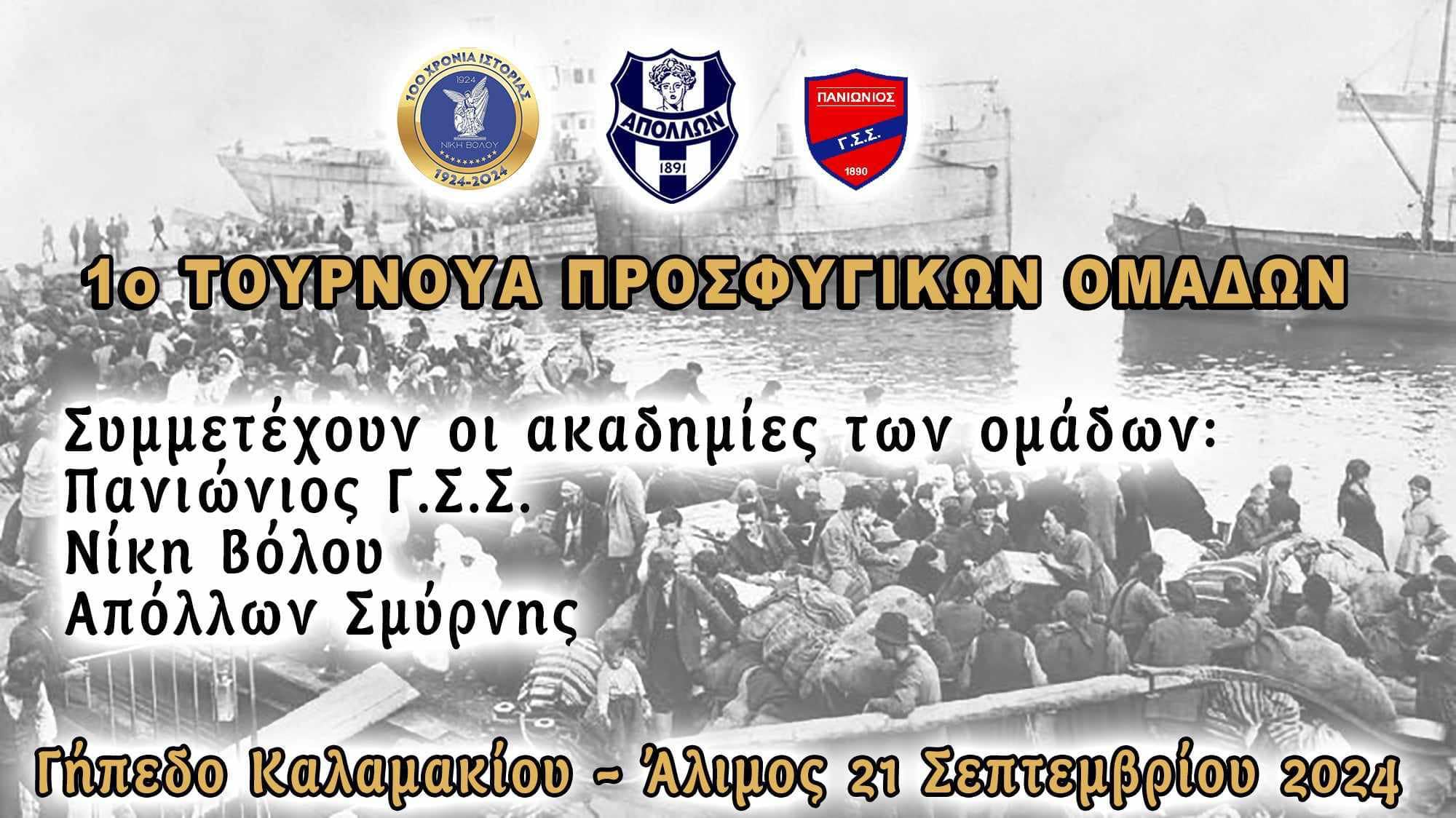 Όπως αναφέρει σχετική ανακοίνωση: «Στο πλαίσιο των προγραμματισμένων επετειακών εκδηλώσεων για τα 100 χρόνια της ΝΙΚΗΣ ΒΟΛΟΥ 1924 σας ενημερώνουμε ότι η ομάδα μας θα συμμετάσχει στην Αθήνα στο 1ο τουρνουά προσφυγικών ομάδων που θα διεξαχθεί 21 Σεπτεμβρίου 2024 στο Γήπεδο του Καλαμακίου στον Άλιμο με τις ομάδες του ΑΠΟΛΛΩΝΑ ΣΜΥΡΝΗΣ και του ΠΑΝΙΩΝΙΟΥ.