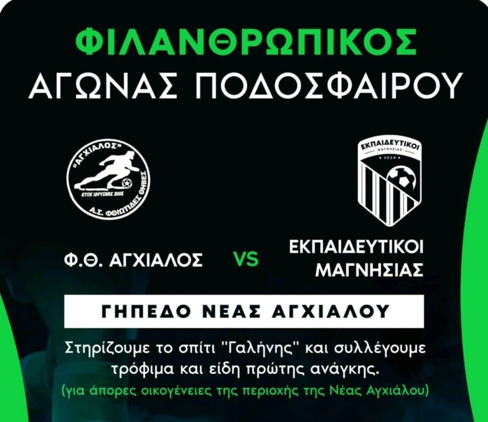 Την κοινωνική διάσταση του ποδοσφαίρου του ποδοσφαίρου αναδεικνύουν την ερχόμενη Κυριακή 18 Μαΐου η ΦΘ Αγχίαλος και οι Εκπαιδευτικοί του Ν. Μαγνησίας, σε φιλικό παιχνίδι που θα δώσουν μεταξύ τους.