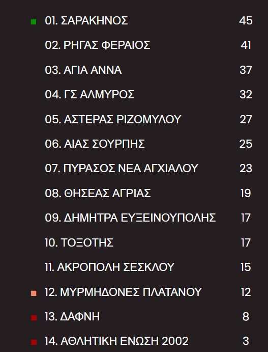 Ο Σαρακηνός ξέφυγε με τέσσερις βαθμούς από τον Ρήγα Φεραίο μετά την 16η αγωνιστική της Α’ ΕΠΣΘ, νικώντας ο ίδιος στη Σούρπη τον Αίαντα με 1-3 και βλέποντας τους Βελεστινιώτες να χάνουν δύο βαθμούς μετά το 1-1 με την Αγία Άννα, έχοντας την πρώτη απώλεια έδρας.