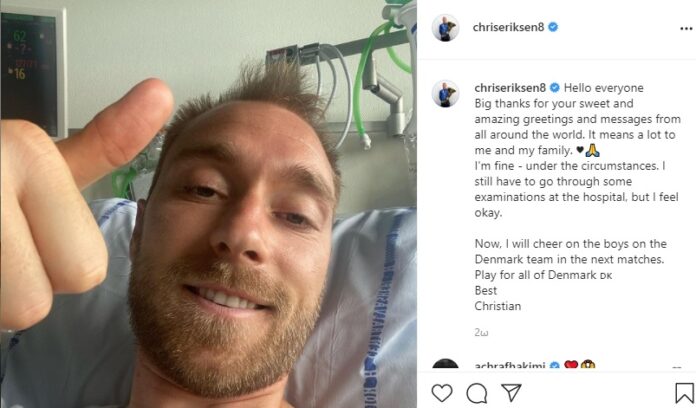 Σε μήνυμα του στο Instagram, ο 29χρονος άσος της Ιντερ, ανήρτησε μία φωτογραφία από το κρεβάτι του νοσοκομείου, με το εξής σχόλιο: «Πρέπει ακόμη να κάνω κάποιες εξετάσεις στο νοσοκομείο, αλλά νιώθω καλά. Τώρα θα υποστηρίξω τα παιδιά της εθνικής ομάδας για τους επόμενους αγώνες. Παίξτε για όλη τη Δανία».