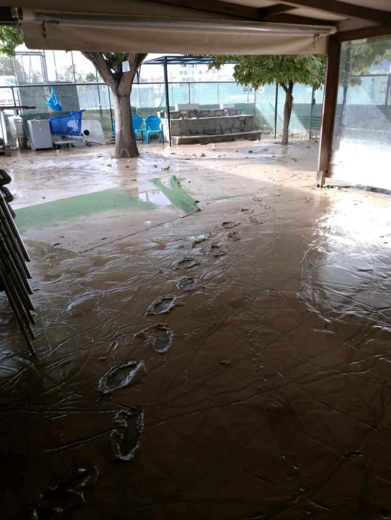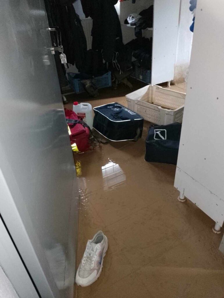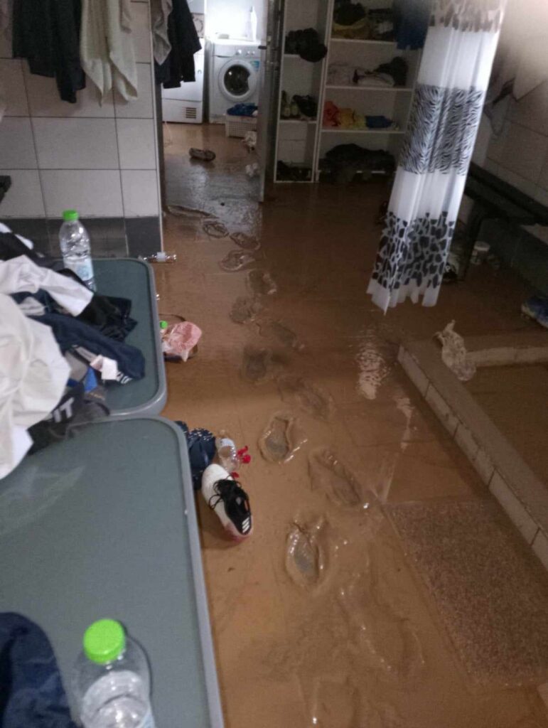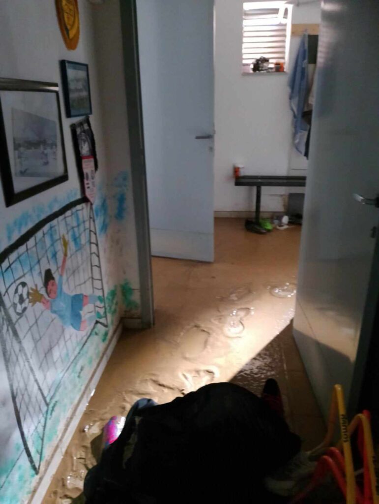 Τα ορμητικά νερά του χειμάρρου έριξαν μέρος της εξωτερικής περίφραξης και μπήκαν στα γραφεία του συλλόγου, αλλά και στα αποδυτήρια. Βρήκαμε θαμμένα στη λάσπη αθλητικό υλικό (φόρμες, φανέλες, παπούτσια κ.α.), όπως και έγγραφα, χρήσιμα για την εύρυθμη λειτουργία του συλλόγου μας.