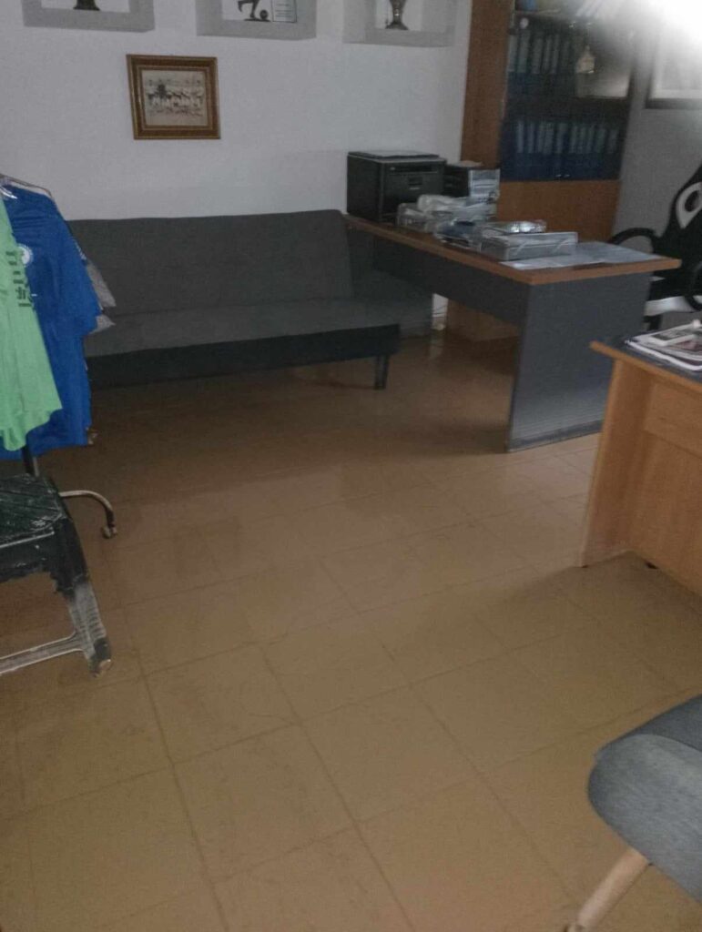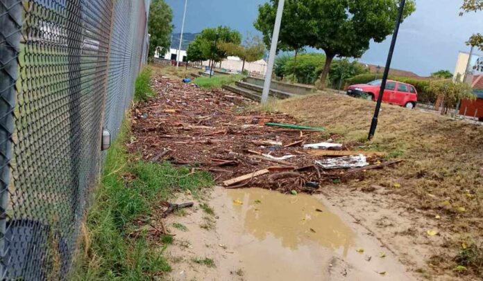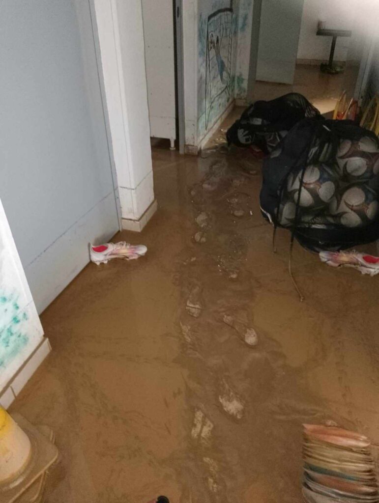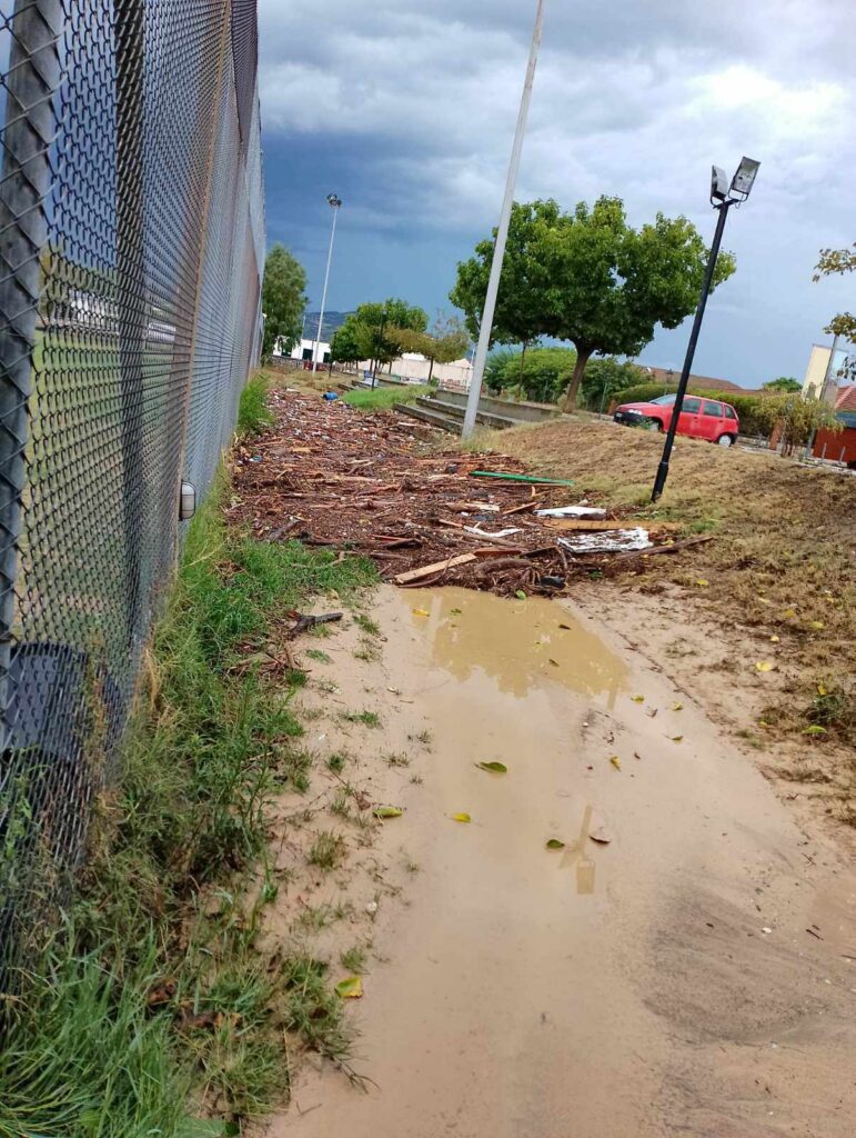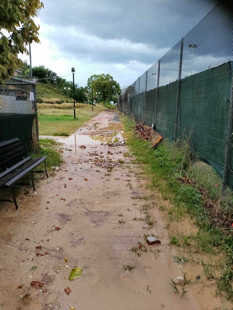 Τα ορμητικά νερά του χειμάρρου έριξαν μέρος της εξωτερικής περίφραξης και μπήκαν στα γραφεία του συλλόγου, αλλά και στα αποδυτήρια. Βρήκαμε θαμμένα στη λάσπη αθλητικό υλικό (φόρμες, φανέλες, παπούτσια κ.α.), όπως και έγγραφα, χρήσιμα για την εύρυθμη λειτουργία του συλλόγου μας.