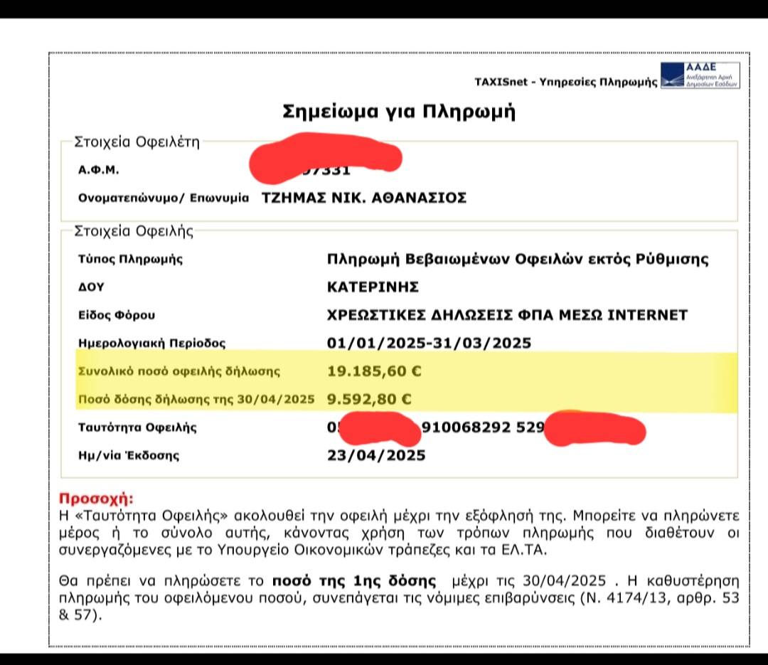 «Κανείς δεν μπορεί να αμφισβητήσει ότι πληρώνω ποσά όπως 10.000 ευρώ και 20.000 ευρώ με ΦΠΑ τον μήνα, χωρίς να τα συμψηφίζω και ότι ο Ολυμπιακός Βόλου έχει πλέον εξυγιανθεί και αποτελεί ομάδα πρότυπο. Και όλα αυτά σε χρόνο ρεκόρ, παρά το γεγονός ότι κάποιοι τον ήθελαν νεκρό (ο σφαγέας διαιτητής Μελτζανίδης δεν μπορεί να μείνει ατιμώρητος) έχοντας μάθει να λειτουργούν διαφορετικά λαμβάνοντας κρατικά βοηθήματα», τόνισε χαρακτηριστικά ο κ. Τζήμας. Έτσι, η ανάρτηση συνοδεύεται και από έγγραφο ταυτότητας οφειλής στο δικό του ΑΦΜ και ονοματεπώνυμο, αλλά και της σχετικής πληρωμής της υψηλής ομολογουμένως δόσης, δείγμα προφανώς όπως μπορεί να εκτιμήσει κανείς ότι καλύπτει τις υποχρεώσεις που έχει σε γενικότερο επίπεδο.