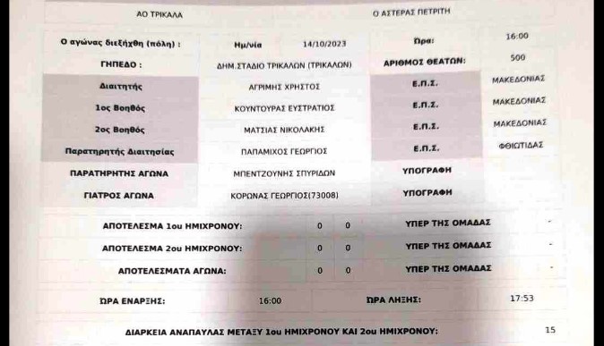 Ο διαιτητής του ματς Α.Ο. Τρίκαλα-Αστέρας Πετριτή 0-1 έγραψε στο φύλλο αγώνα ότι το τελικό αποτέλεσμα ήταν 0-0 και οι γηπεδούχοι σε ανάρτησή τους σχολιάζουν: