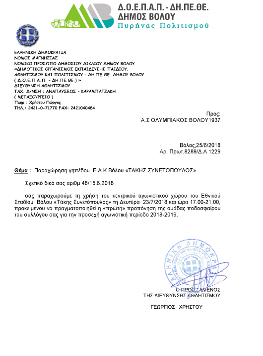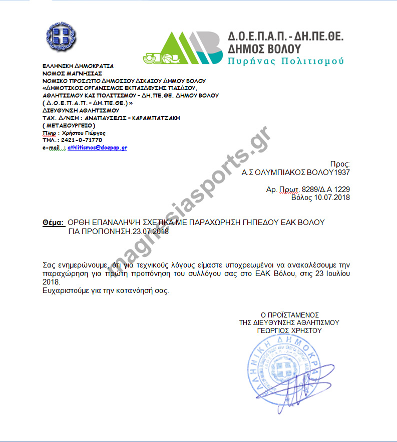 “Πόλεμο” κατά της ομάδας “βλέπουν” οι διοικούντες του Ολυμπιακού Βόλου με αφορμή το νέο “χτύπημα” από πλευράς του ΔΟΕΠΑΠ-ΔΗΠΕΘΕ να ανακαλέσει προηγούμενη απόφασή του για την παραχώρηση του ΕΑΚ Βόλου για την πρώτη προπόνηση της ομάδας. Με το με Αρ. Πρωτ. 8289/Δ.Α 1229 έγγραφό που έστειλε σήμερα ο ΔΕΟΠΑΠ-ΔΗΠΕΘΕ, ανακαλεί προηγούμενη απόφαση για την παραχώρηση του Σταδίου ΕΑΚ για την επίσημη πρώτη του Ολυμπιακού Βόλου στις 23 Ιουλίου επικαλούμενος “τεχνικούς λόγους” τους οποίους όμως δεν προσδιορίζει επακριβώς. Με δεδομένο ότι δεν έχουν προχωρήσει οι απαραίτητες διαδικασίες για την έναρξη των εργασιών αναβάθμισης που θα χρηματοδοτήσει η Περιφέρεια Θεσσαλίας στο ΕΑΚ η συγκεκριμένη κίνηση προκαλεί απορία ως προς την σκοπιμότητά της.
