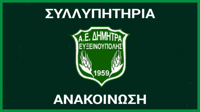 Η ΑΕ Δήμητρας Ευξεινούπολης, εκφράζει τη βαθιά της θλίψη για την τραγική απώλεια του Νικόλαου Σαρρή, πατέρα του επί σειρά ετών τερματοφύλακα της ομάδας, Γιώργου Σαρρή.