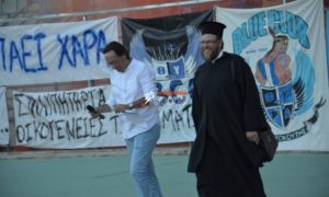 Ο γνωστός για τα νικιώτικα συναισθήματα ιερέας της Ευαγγελίστριας αναγκάστηκε να περιμένει αρκετή ώρα, για να εισέλθει στον στίβο του Πανθεσσαλικού, γιατί έπρεπε πρώτα να καθαρίσει η ατμόσφαιρα από τα καπνογόνα που άναψαν οι φίλοι της Νίκης, οι οποίοι φρόντισαν να δώσουν το πιο δυνατό στιγμιότυπο της εκδήλωσης.