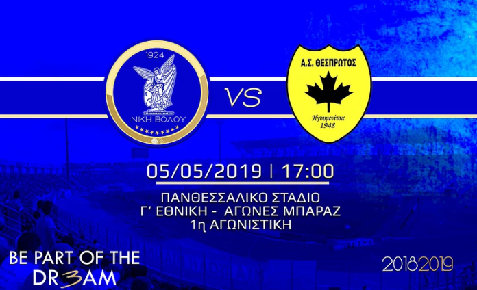“Η Δ.Ε. Ποδοσφαίρου της Νίκης Βόλου 1924 ενημερώνει για τις τιμές των εισιτηρίων και τη διαδικασία εισόδου των φιλάθλων στο Πανθεσσαλικό Στάδιο για τον αγώνα Νίκη Βόλου-Θεσπρωτός, για την 1η αγωνιστική των αγώνων μπαράζ της Γ’ Εθνικής 2018-2019, την Κυριακή 5 Μαΐου 2019 στις 17:00.