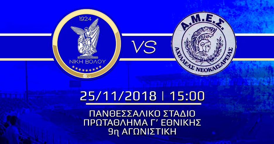 Η Δ.Ε. Ποδοσφαίρου της Νίκης Βόλου 1924 ενημέρωσε για τις τιμές των εισιτηρίων και τη διαδικασία εισόδου των φιλάθλων στο Πανθεσσαλικό Στάδιο για τον αγώνα Νίκη Βόλου – Αχιλλέας Νεοκαισάρειας για την 9η αγωνιστική του 4ου Ομίλου της Γ’ Εθνικής 2018-2019, την Κυριακή 25 Νοεμβρίου 2018 στις 15:00.