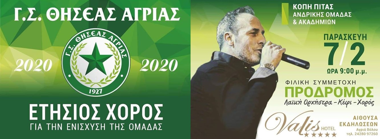 Την Παρασκευή 7 Φεβρουαρίου στο ξενοδοχείο Valis θα πραγματοποιηθεί ο ετήσιος χορός της ομάδας του Θησέα Αγριάς στον οποίο θα γίνει και η κοπή της πίτας, της ανδρικής ομάδας καθώς και των ακαδημιών.