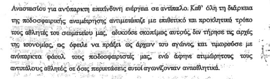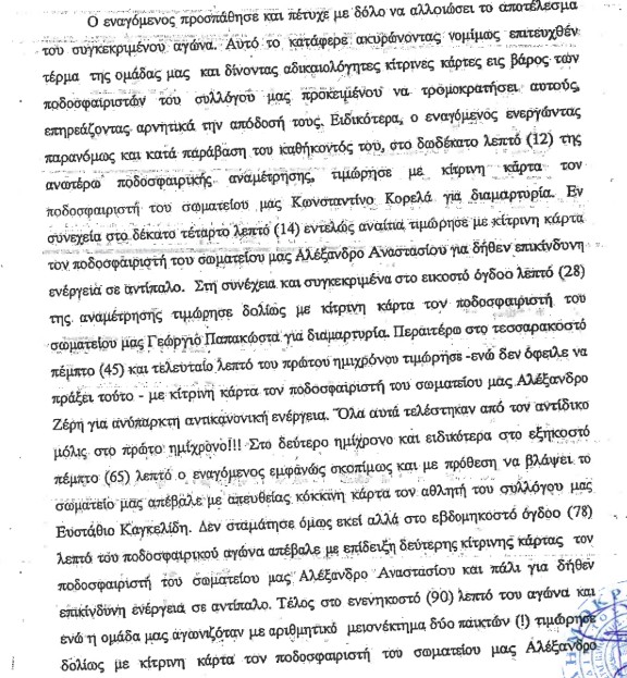 Στην αγωγή υπάρχει και αναλυτική παράθεση των αδικιών που υπέστη από τον διαιτητή Γιώργο Μελτζανίδη της ΕΠΣ Ημαθίας ο Ολυμπιακός Βόλου στο εκτός έδρας ματς με τον Αιγινιακό και στο οποίο υποχρεώθηκε σε ήττα από τον εν λόγω διαιτητή.