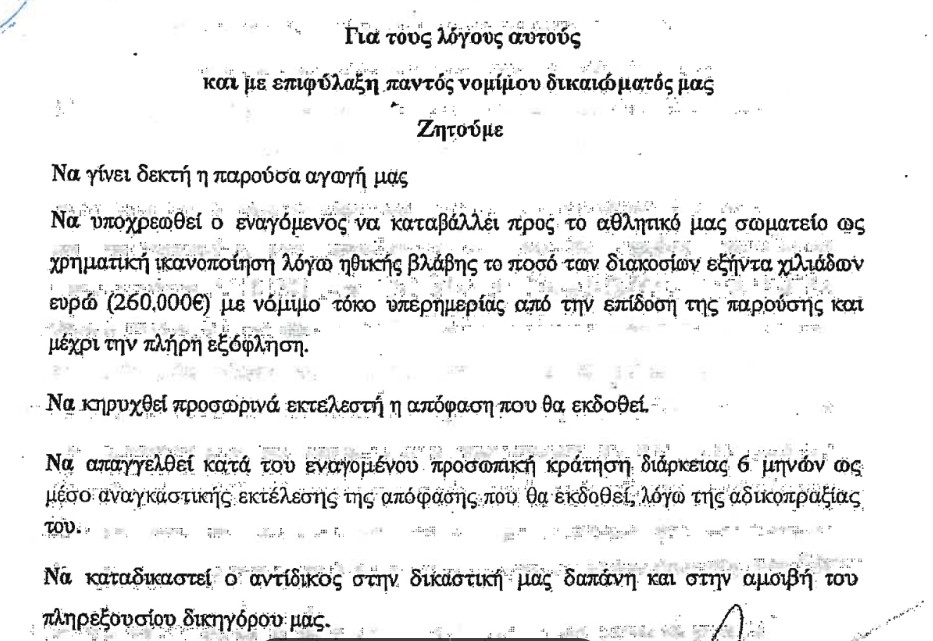 Με την αγωγή εναντίον του, ενώ διεκδικεί και αποζημίωση 260 χιλιάδων ευρώ