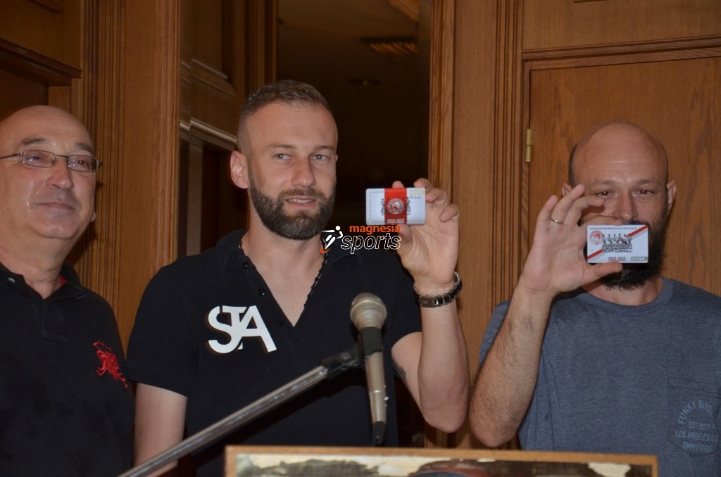 O γενικός γραμματέας του Ολυμπιακού Βόλου, κ. Δημήτρης Μουρτζίνος, παρουσίασε στο ΠΑΡΚ τις τιμές και τις κατηγορίες των διαρκείας, με τα οποία φωτογραφήθηκαν οι Στάθης Ρόκας και Κώστας Φλίγκος από τη μεριά των ποδοσφαιριστών, η Μελίνα Μουρτζίνου, ο νεαρός φίλαθλος Βαγγέλης Λιάλιος και ο Θάνος Καποτάς, που παίζει στην ακαδημία ποδοσφαίρου.