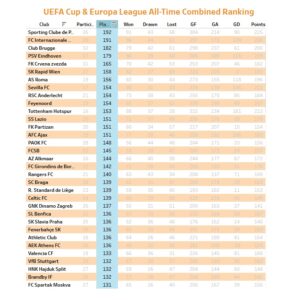 Ακολουθεί η Κλαμπ Μπριζ με 182, η Αϊντχόφεν με 179 και ο Ερυθρός Αστέρας με 165 ολοκληρώνει την πεντάδα. Στη 15η θέση της σχετικής λίστας βρίσκουμε και τον ΠΑΟΚ με 148 αναμετρήσεις.