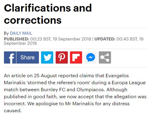 Συγκεκριμένα, στο άρθρο-επανόρθωση-συγνώμη της αγγλικής εφημερίδας αναφέρονται τα εξής: «Σε άρθρο της 25ης Αυγούστου μεταφέραμε ισχυρισμούς ότι ο Ευάγγελος Μαρινάκης “εισέβαλε στο γραφείο του διαιτητή” κατά τη διάρκεια του αγώνα για το Europa League, μεταξύ της Μπέρνλι και του Ολυμπιακού. Αν και δημοσιεύτηκε με καλή πίστη, αποδεχόμαστε τώρα ότι ο ισχυρισμός ήταν λανθασμένος. Ζητούμε συγνώμη από τον κ. Μαρινάκη για κάθε δυσφορία που του προκαλέσαμε».