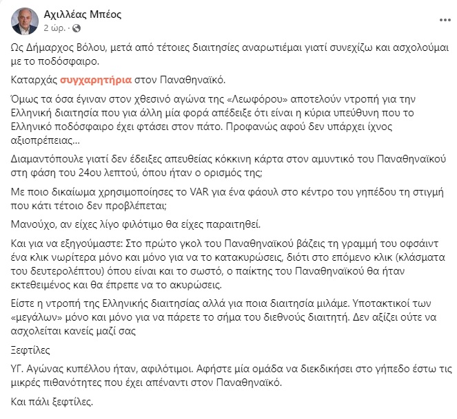 «Ως Δήμαρχος Βόλου, μετά από τέτοιες διαιτησίες αναρωτιέμαι γιατί συνεχίζω και ασχολούμαι με το ποδόσφαιρο. Καταρχάς συγχαρητήρια στον Παναθηναϊκό.