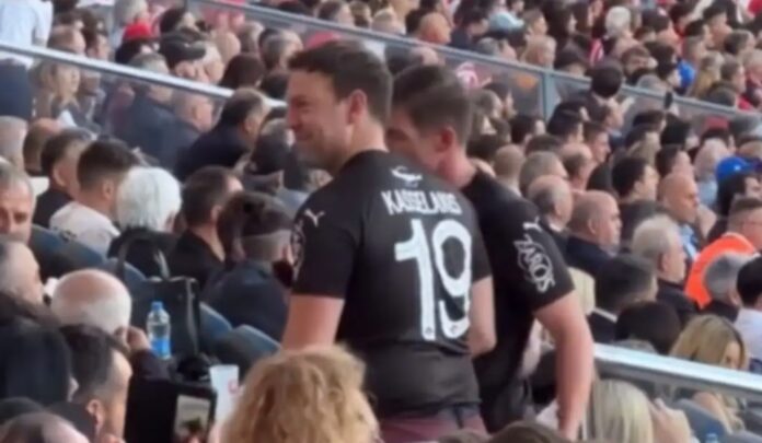 Οι δύο άνδρες εμφανίστηκαν μάλιστα στην εξέδρα με φανέλες του ΟΦΗ, με τον Κασσελάκη να έχει το επώνυμό του και το νούμερο 19 στο πίσω μέρος της δικής του εμφάνισης.