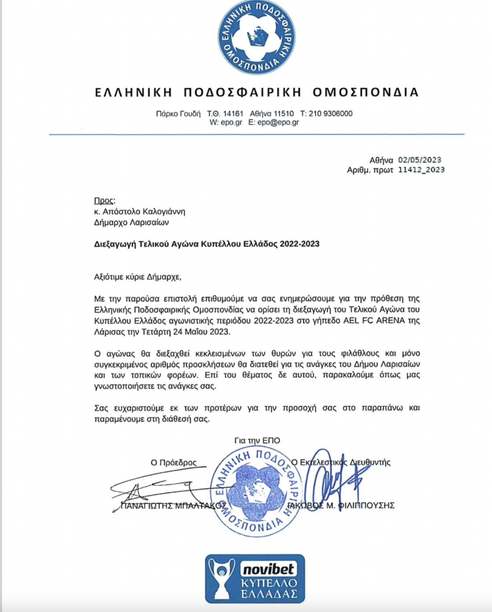 Την κατηγορηματική αντίθεση του Δήμου Λαρισαίων στη διεξαγωγή του Τελικού του Κυπέλου Ελλάδας, στην πόλη της Λάρισας, ακόμα και εάν αυτό διεξαχθεί, κεκλεισμένων των θυρών και μόνο με την διανομή προσκλήσεων, εκφράζει ο δήμαρχος Λαρισαίων Απόστολος Καλογιάννης σε απαντητική επιστολή του προς τον πρόεδρο τη ΕΠΟ κ. Παν. Μπαλτάκο και τον εκτελεστικό διευθυντή της Ομοσπονδίας κ. Ιακ. Φιλιππούση.