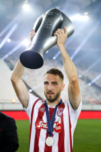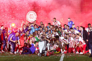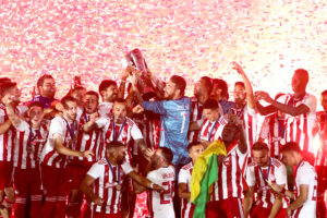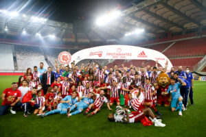 Ο Βαγγέλης Μαρινάκης παρέλαβε το τρόπαιο δια χειρός της αναπληρώτριας προέδρου της Λίγκας, Κάτιας Κοξένογλου, το σήκωσε πρώτος και στη συνέχεια το πανηγύρισε μαζί με την υπόλοιπη ομάδα: τον Πέδρο Μαρτίνς, που πανηγύρισε έξαλλα το πρώτο πρωτάθλημα της καριέρας του, αλλά φυσικά και με τους πρωταγωνιστές της φετινής πορείας, δηλαδή τους ποδοσφαιριστές που ξέσπασαν σαν μικρά παιδιά.