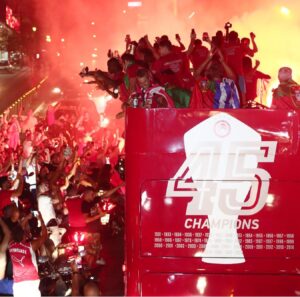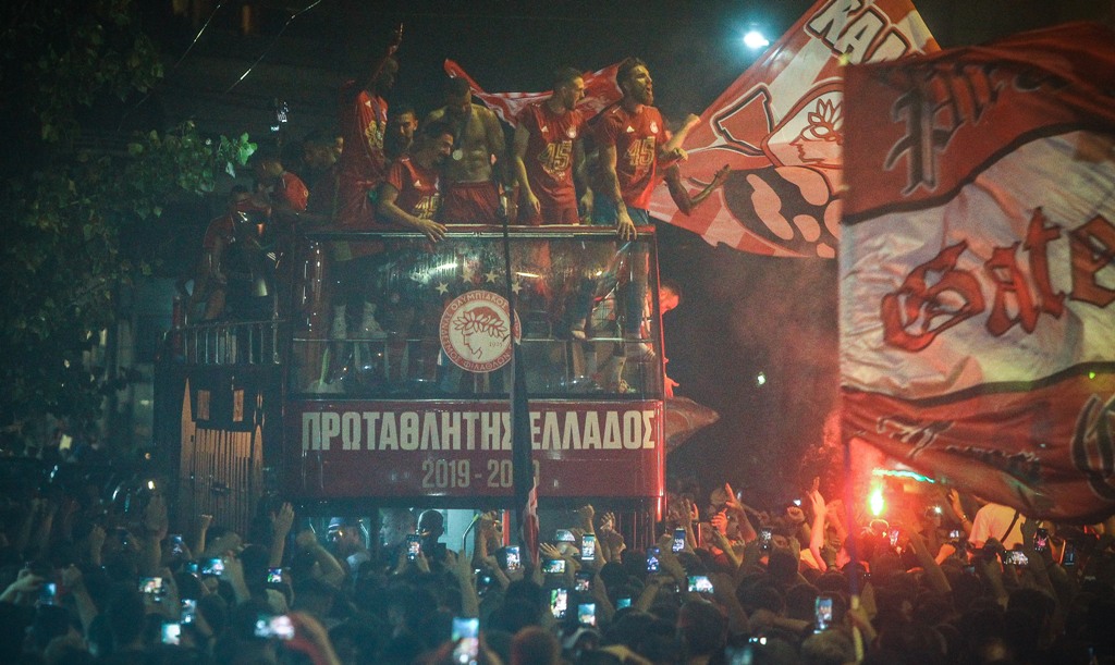 Αφού το τρόπαιο πέρασε από τα χέρια όλων των παικτών, αλλά και όσων είχαν συνδρομή (ο καθένας από το δικό του πόστο), ώστε να επιστρέψει η ομάδα του Πειραιά στον θρόνο της, ακολούθησε η επόμενη… πίστα. Οι ποδοσφαιριστές ανέβηκαν στο ειδικά διαμορφωμένο πούλμαν της ομάδας και έκαναν τον γύρο του Πειραιά, ώστε να καλυφθεί το «κενό» που αναγκαστικά υπήρξε λόγω του κορωνοϊού. Οι ερυθρόλευκοι γιόρτασαν το πρωτάθλημα με έντονη παρουσία κόσμου στο πλάι τους.