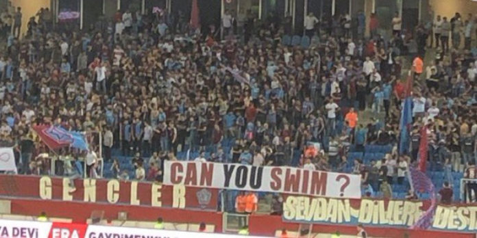 Το εν λόγω πανό το οποίο περιέφεραν προκλητικά στις εξέδρες καθόλη τη διάρκεια του ματς και φανατικοί φίλοι της τουρκικής ομάδας, το επιδείκνυαν. Σε μια πόλη που κάποτε ανθούσε ο ελληνισμός. «Can you swim?» έγραφε το πανό, δηλαδή «ξέρεις να κολυμπάς;» με τους επιτελείς της UEFA να επιτρέπουν να περιφέρεται στις εξέδρες, γυρισμένο προς την πλευρά όπου βρίσκονταν οι Ελληνες φίλοι της ΑΕΚ. Κι όσοι αντιλαμβάνονται, ο υπαινιγμός των Τούρκων οπαδών ήταν σαφής και ξεκάθαρος για την Μικρασιατική Καταστροφή. Οι φίλοι της ΑΕΚ εξοργίστηκαν, διαμαρτυρήθηκαν έντονα στην ΠΑΕ ΑΕΚ, ενώ την ίδια ώρα η UEFA ήταν άπραγη.