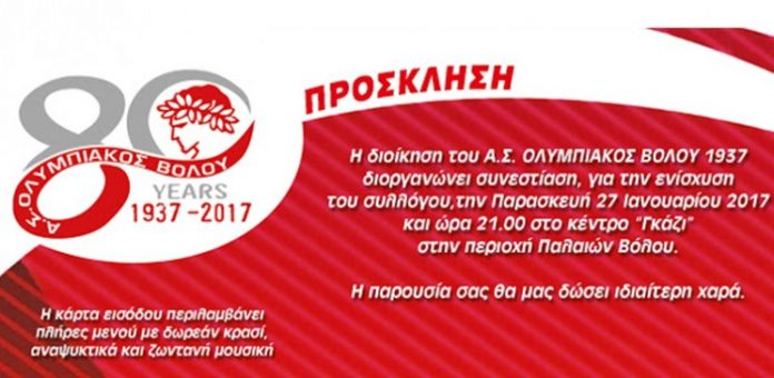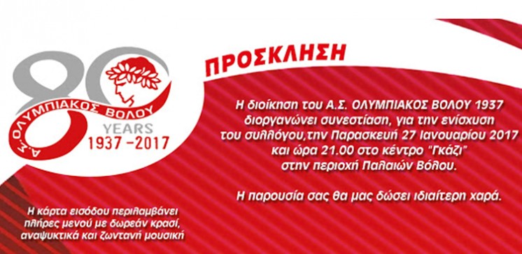 «Την Παρασκευή 27 Ιανουαρίου 2017 και ώρα 21.00, στο Οικογενειακό Κέντρο Διασκέδασης «ΓΚΑΖΙ» , που αποτελεί και χορηγό της ομάδας μας, στα Παλιά του Βόλου, Παγασών-Φερρών , θα πραγματοποιηθεί ο ετήσιος χορός που διοργανώνει ο ΑΣ ΟΛΥΜΠΙΑΚΟΣ ΒΟΛΟΥ 1937.