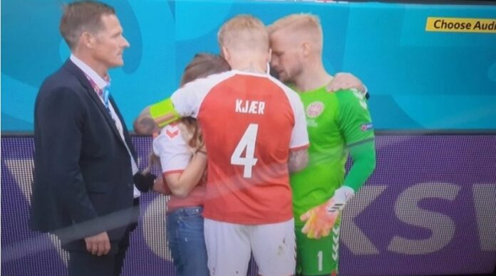 Συκγλονιστικές εικόνες στην Κοπεγχάγη με τον Κρίστιαν Έρικσεν να καταρρέει στον αγωνιστικό χώρο και τους συμπαίκτες του, Κάσπερ Σμάιχελ και Σίμον Κιάερ, να αγκαλιάζουν τη σύντροφό του, η οποία κατέβηκε στον αγωνιστικό χώρο.