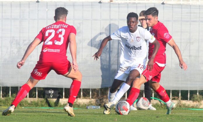 Οι γηπεδούχοι προσπάθησαν να αιφνιδιάσουν στην αρχή τους βυσσινί, με τον Περντρέου στο 5’ να αναγκάζεται σε δύσκολη απόκρουση στο σουτ του Έππα, ενώ στο 30’ η ομάδα του Αλέκου Βοσνιάδη είχε μία πολύ καλή στιγμή στο 30’, όταν από σέντρα του Μπαριέντος ο Στίνα με προβολή δεν μπόρεσε να νικήσει τον Κασαπίδη που μπλόκαρε.