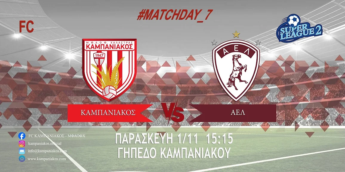 Η 7η αγωνιστική της Σούπερ Λιγκ 2 ξεκινά σήμερα Παρασκευή (1/11) με το παιχνίδι του 1ου ομίλου ανάμεσα στην πρωτοπόρο με 16 βαθμούς ΑΕΛ και τον πέμπτο με εννιά πόντους Καμπανιακό, που θα υποδεχτεί τους «βυσσινί» στο γήπεδο της Χαλάστρας (15:15/monobala.gr).