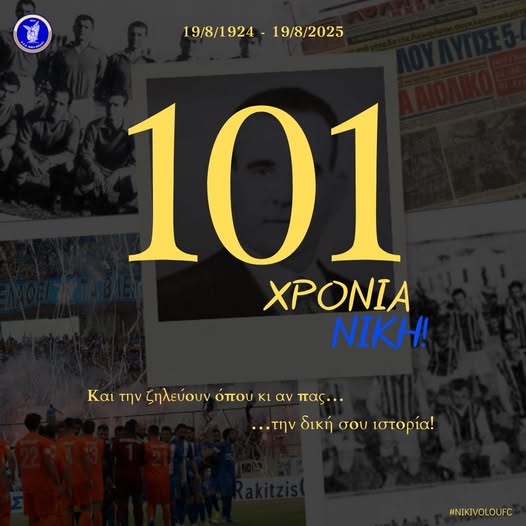 101 χρόνια ζωής συμπληρώνει σήμερα Τρίτη (19/8) η Νίκη Βόλου και η κυανόλευκη ΠΑΕ αναφέρει: