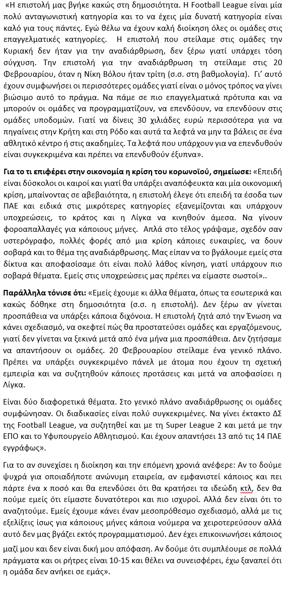 Στον ραδιοφωνικό σταθμό «Bόλος 98.6» και στην εκπομπή «Classico» έκανε δηλώσεις με την ιδιότητα του μέλους του ΔΣ της ΠΑΕ Νίκη Βόλου, Αλέξης Παπακωνσταντίνου, αναφερόμενος στην επιστολή που ήρθε στη δημοσιότητα, με αίτημα να ληφθούν μέτρα για την προστασία των ομάδων από τις συνέπειες του κορωνοϊού, αλλά και με σημείωση για αναδιάρθρωση των πρωταθλημάτων.