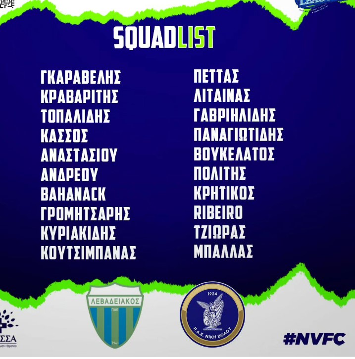 Ο Στίκας, που έχει πυρετό, ο Ναά, που συνεχίζει τη θεραπεία του στον αστράγαλο, και ο Μοράρ για καθαρά αγωνιστικούς λόγους κόπηκαν από την αποστολή του εκτός έδρας αγώνα με τον Λεβαδειακό αύριο Δευτέρα (8/1, 15.00) για την 16η αγωνιστική του 1ου ομίλου της SL2.
