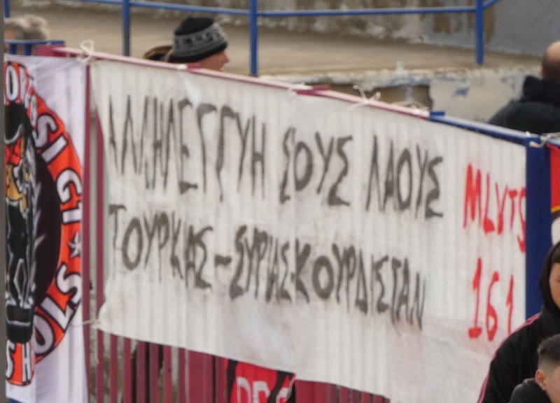 Έτσι και οι οργανωμένοι του Ολυμπιακού Βόλου, εξέφρασαν τη στήριξή τους στους δοκιμαζόμενους ανθρώπους, με το πανό που ανάρτησαν να είναι χαρακτηριστικό. «Αλληλεγγύη στους λαούς, Τουρκίας-Συρίας-Κουρδιστάν» ανέφερε συγκεκριμένα το πανό των «Malavetas».