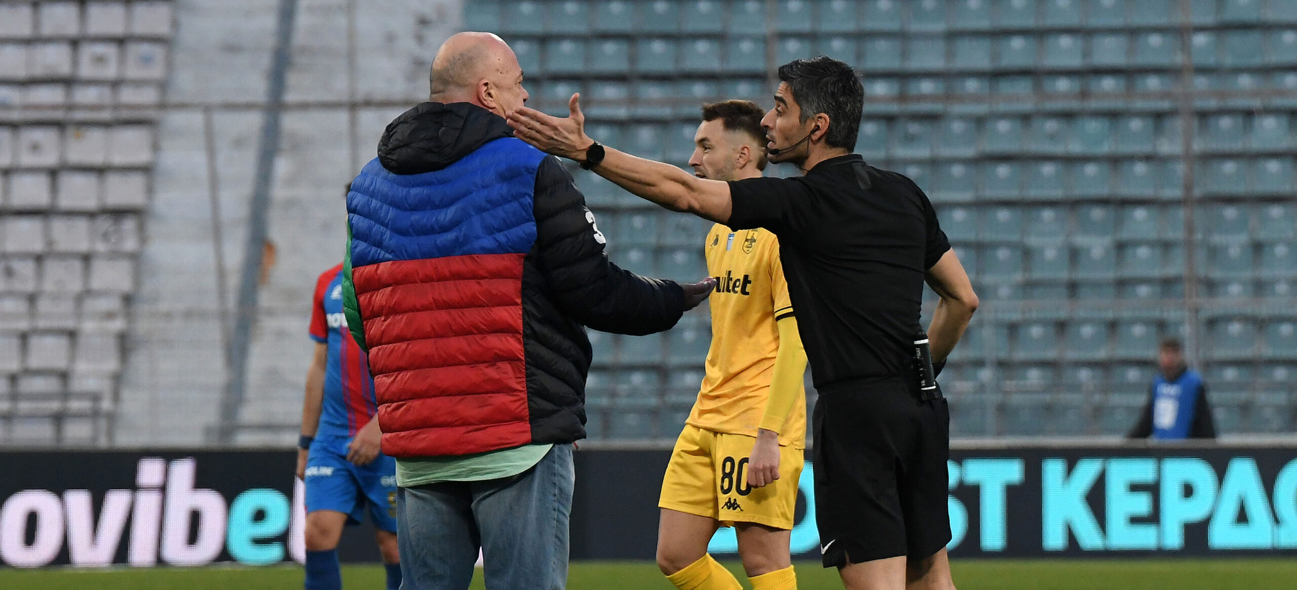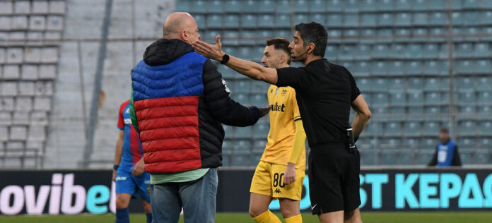 Η ανάρτηση εμφανίζει τον δήμαρχο του Βόλου να είναι εντός του αγωνιστικού χώρου και να διαμαρτύρεται.