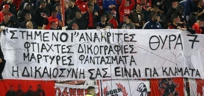 Συγκεκριμένα, η απόφαση αναφέρει: «Eπέβαλε με την υπ’ αριθμό 3/2025 Απόφασή της, σε βάρος της ΠΑΕ ΟΛΥΜΠΙΑΚΟΣ, τη διοικητική κύρωση προστίμου ύψους είκοσι χιλιάδων ευρώ (20.000€), για ανάρτηση ενός πανό από φιλάθλους της στη θύρα 3 του γηπέδου «Γ. Καραϊσκάκης», ιδεολογικού χαρακτήρα και υβριστικού περιεχομένου σε βάρος της ελληνικής δικαιοσύνης («ΣΤΗΜΕΝΟΙ ΑΝΑΚΡΙΤΕΣ – ΦΤΙΑΧΤΕΣ ΔΙΚΟΓΡΑΦΙΕΣ – ΜΑΡΤΥΡΕΣ ΦΑΝΤΑΣΜΑΤΑ – Η ΔΙΚΑΙΟΣΥΝΗ ΕΙΝΑΙ ΓΙΑ ΚΛΑΜΑΤΑ – ΘΥΡΑ 7), κατά τον αγώνα ΠΑΕ ΟΛΥΜΠΙΑΚΟΣ – ΠΑΕ ΠΑΝΑΘΗΝΑΪΚΟΣ στις 26/01/2025 για την 20η αγωνιστική του Πρωταθλήματος της Super League 1, αγωνιστικής περιόδου 2024-2025.»